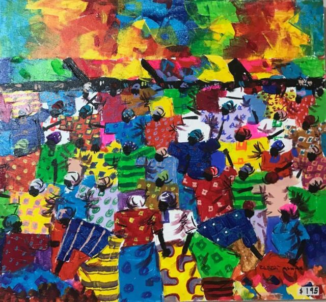 That boy was me when l was growing up ,In every market painting that I do, there is always a figure or a posture like someone I know back in the village, it could be our noisy neighbor who sang all day tunelessly her bad voice notwithstanding, she terrorized the whole village with her bad singing ,she reminded me of either a frog trapped in a bottle trying to croak itself out or someone singing while biting on a piece of hard wood with your nose pinched. When she started singing her dog also barked in unison or it could be our querulous neighbor who fought everyone. Sometimes it is our other neighbor who always smiled endlessly or our other mean neighbor who never let her children out to play with the other children, ironically we would meet at school and play as much.